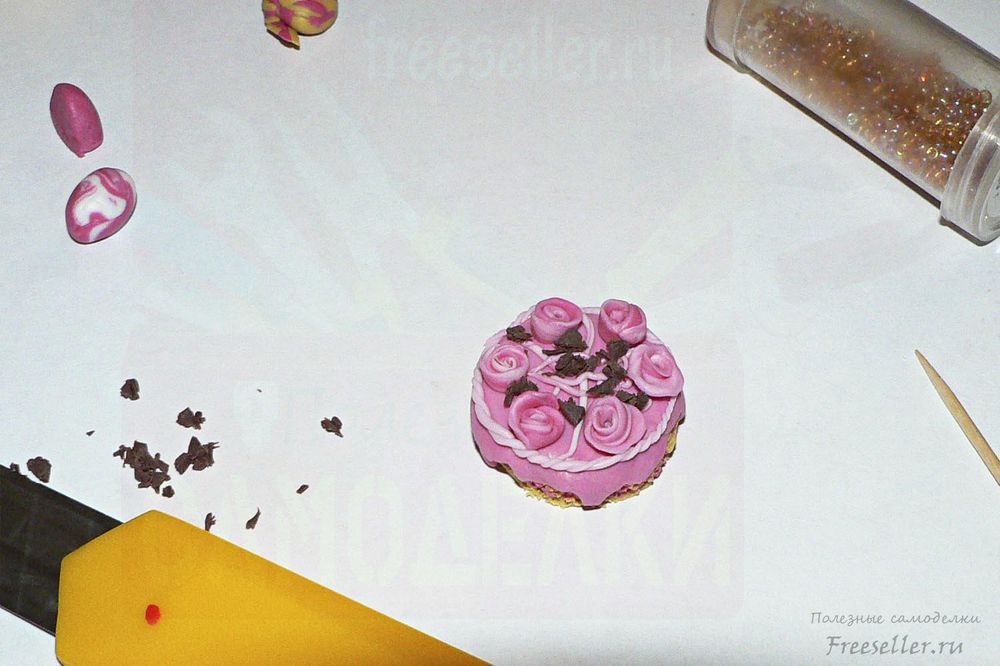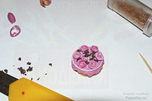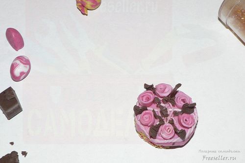 Аккуратно нарезаем коричневую пластику маленькими равными плоскими кусочками и укладываем между розами - это выглядит как кусочки шоколада.