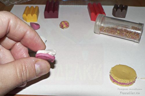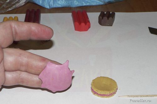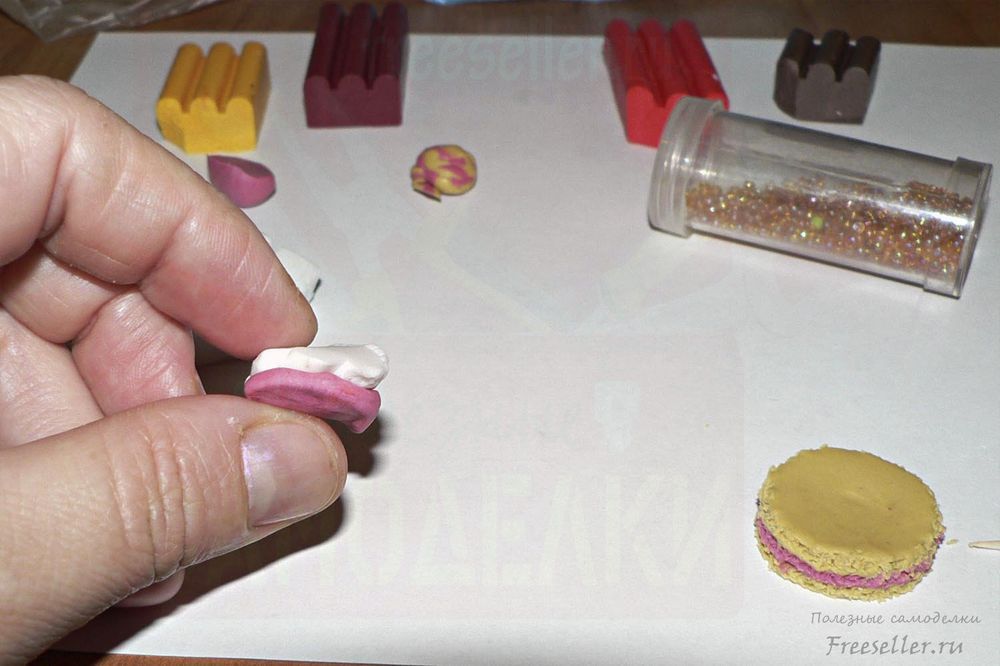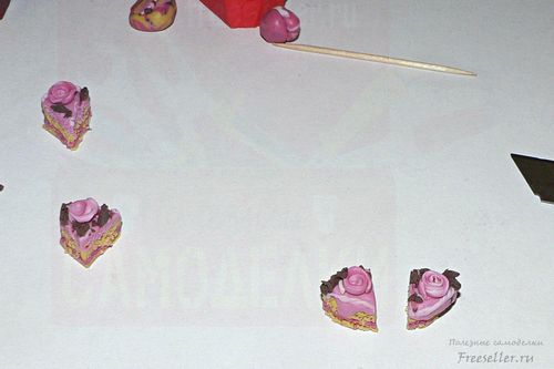 Теперь нарезаем торт на несколько кусков, выбираем максимально схожие друг с другом - они и будут нашими серьгами. Не забываем взрыхлить пластику на местах срезов. Остальные кусочки мы также запечем и используем их либо для создания браслета, либо в качестве «угощения» в кукольной гостиной.