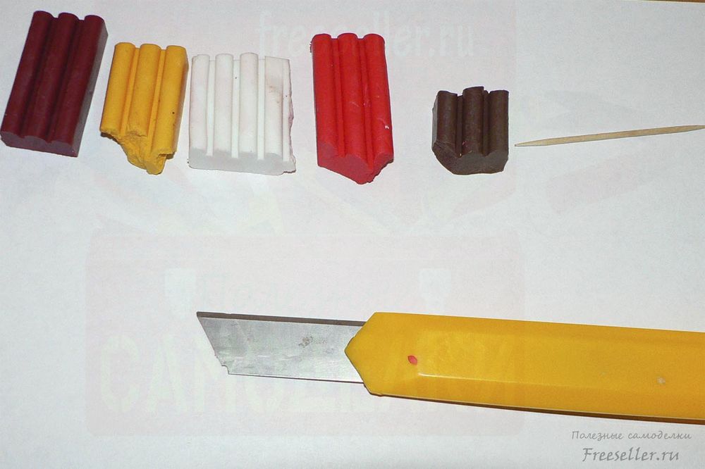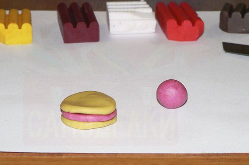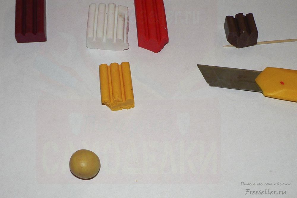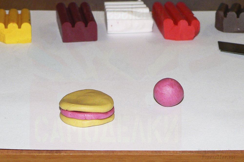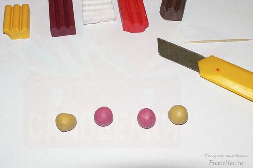 Для того возьмем белую, красную и бордовую пластику, смешаем очень тщательно и скатаем шар такого же размера, что и первый. Разделим шары пополам и скатаем теперь уже четыре шарика одинакового размера, по два каждого цвета.