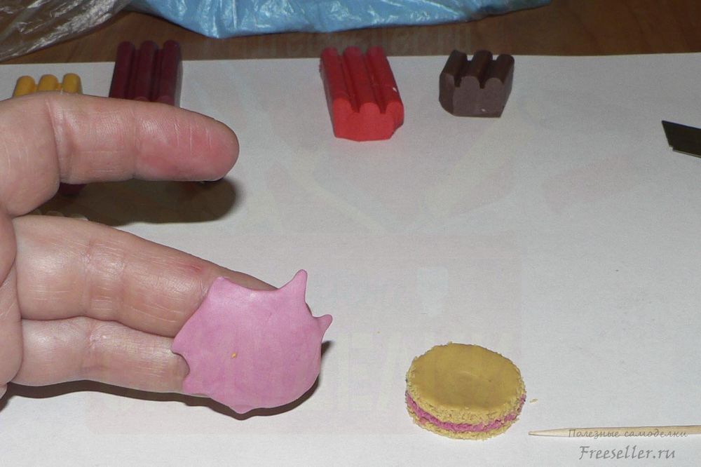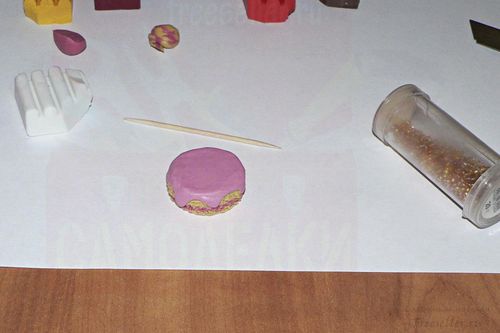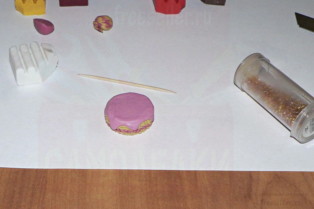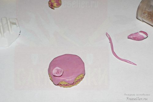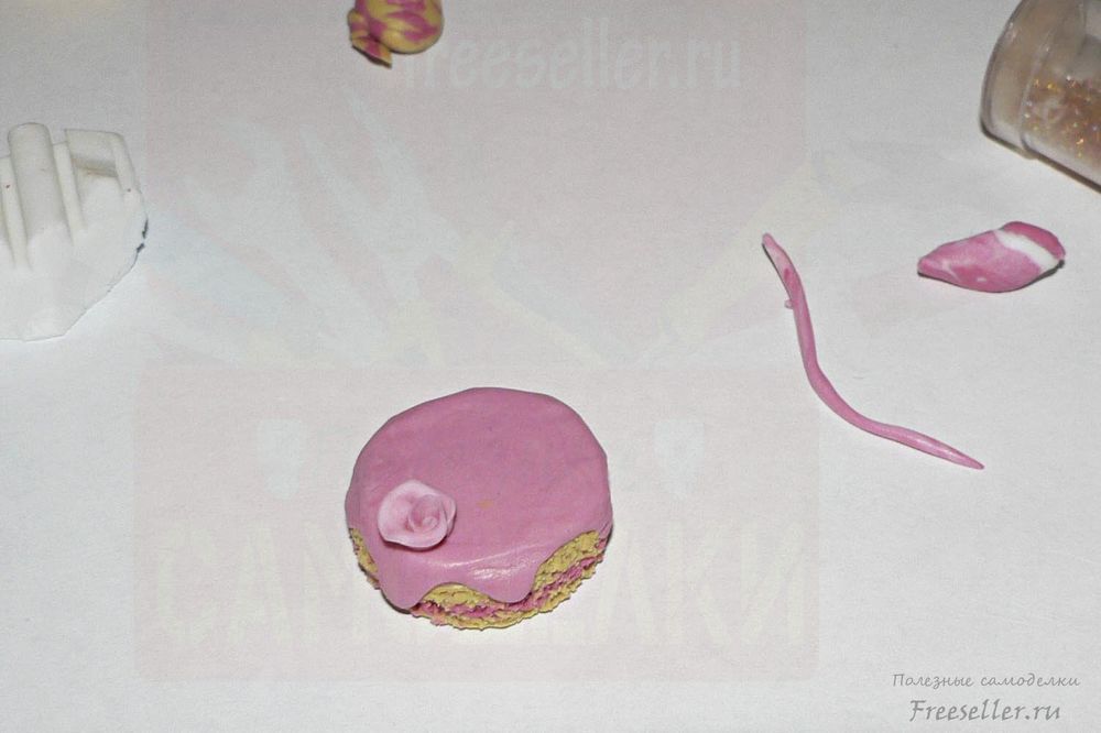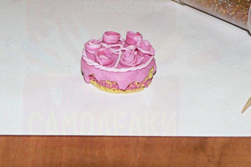 От оставшегося розового шарика отрезаем немного и смешиваем с белым цветом - получаем материал для «заливки» тортика. Формируем покрытие торта, вытягивая «подтеки» глазури.