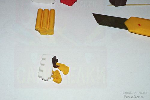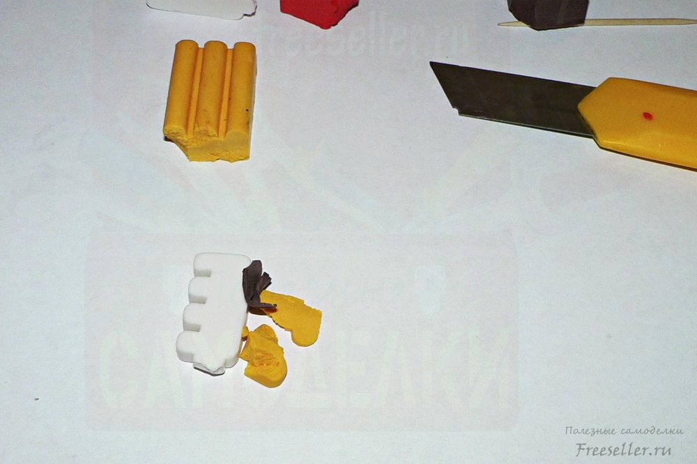 Начнем с приготовления пластики по цвету напоминающей бисквит. Смешаем для этого белую, немного желтой и коричневой пластики.