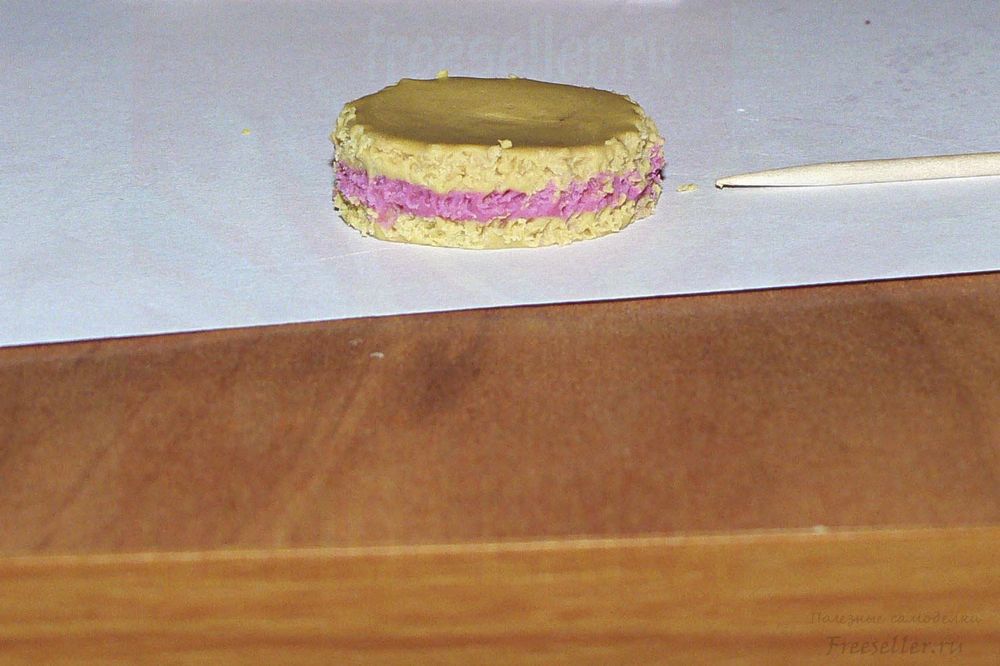 Один розовый отложим для дальнейшей работы, а два бисквитных и один розовый раскатаем в одинаковые лепешки и соберем тортик.