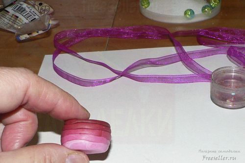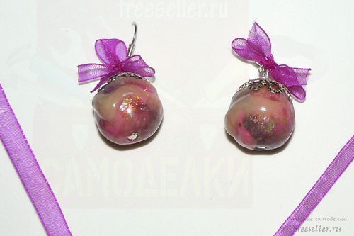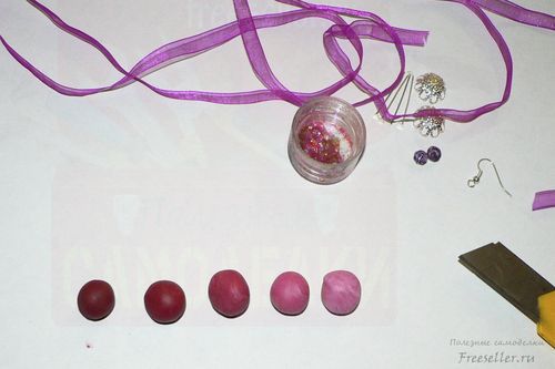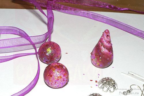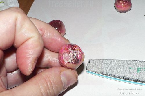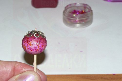 Обкатываем бусины сначала в пальцах, придаем им нужную форму, затем хорошенько обваливаем в кусочках органзы, чтобы они вдавись в пластику. Делаем отверстие в бусине, вворачивая в нее деревянную зубочистку сначала с одной стороны, затем с другой.