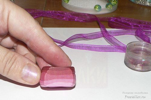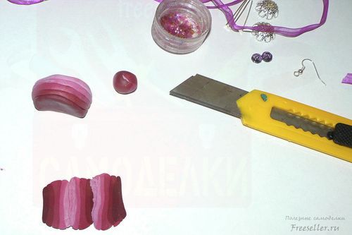 Затем нарезаем на тонкие пласты и оклеиваем ими заготовки бусин из глины любого оттенка.