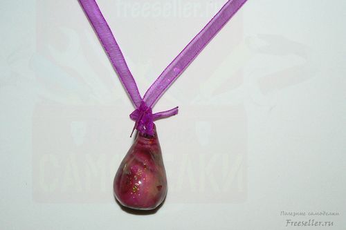 Из остатков слоистой пластики можно сделать подвеску. Делаем заготовку удлиненной капли-ракушки , оборачиваем слоистой пластикой, обваливаем в органзе.