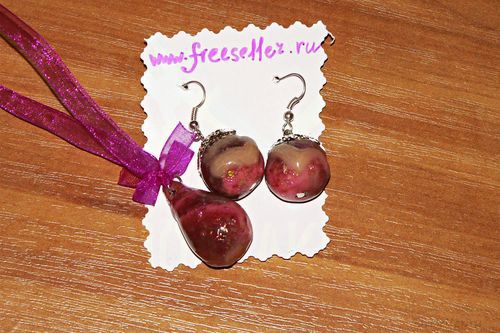 Покрываем лаком или сначала жидкой пластикой, имитируя наплывы (тогда снова ставим на обжиг). Если у вас нет жидкой пластики, просто шлифуйте, протирайте от пыли и покрывайте лаком. После высыхания бусин начинаем сборку украшения.