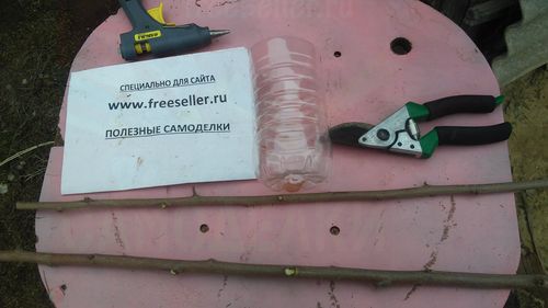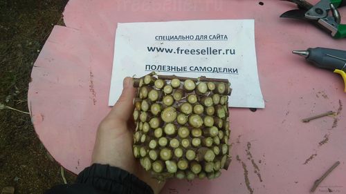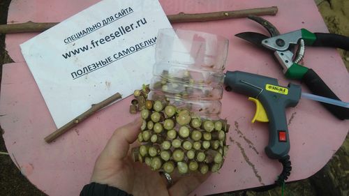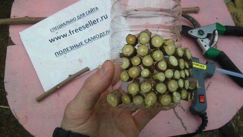 Затем при помощи термоклея приклеиваем кусочки веточек к бутылке.