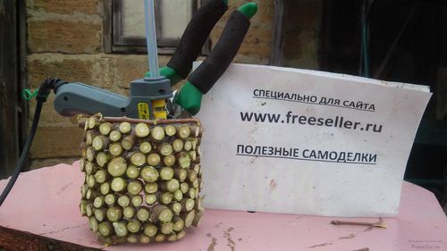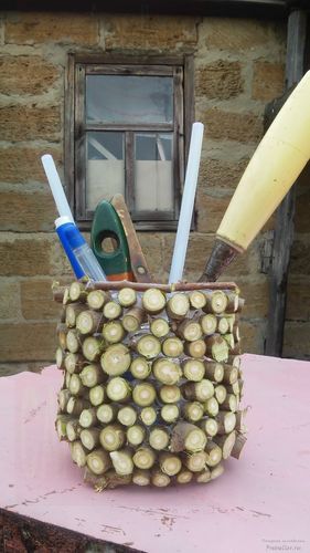 Оригинальную и красивую подставку для хранения мелочей, можно изготовить из обычной пластиковой бутылки и природных материалов, в данном случае, обрезаных веточек.