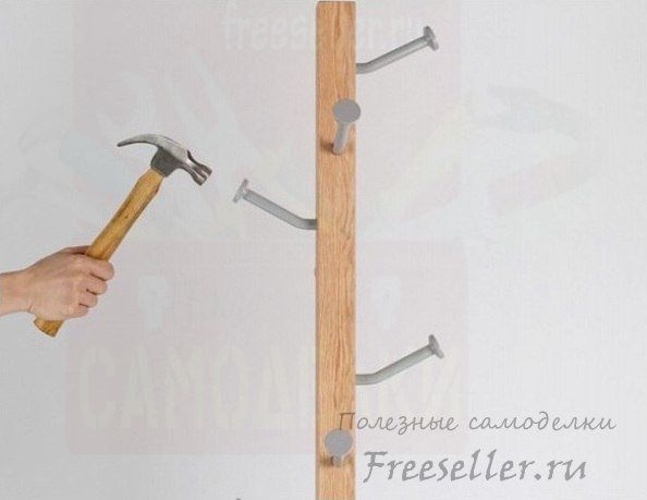Необычная самодельная арт-вешалка из бруса и гвоздей.