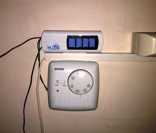 Для пульта с термостатом нашлось временное место в «хозяйственном уголке» поближе к розетке. Планируется в летний период оформить штатное расположение. Сам термостат не подключается к сети 220 Вольт. Используются только его контакты в «сухом» виде. Нормально разомкнутые.