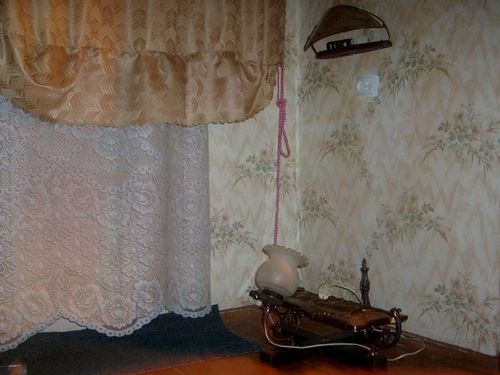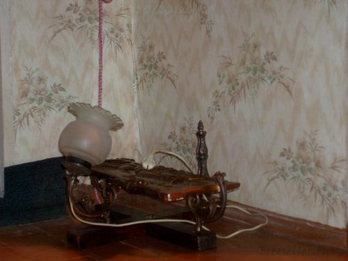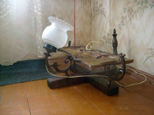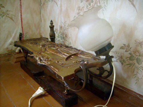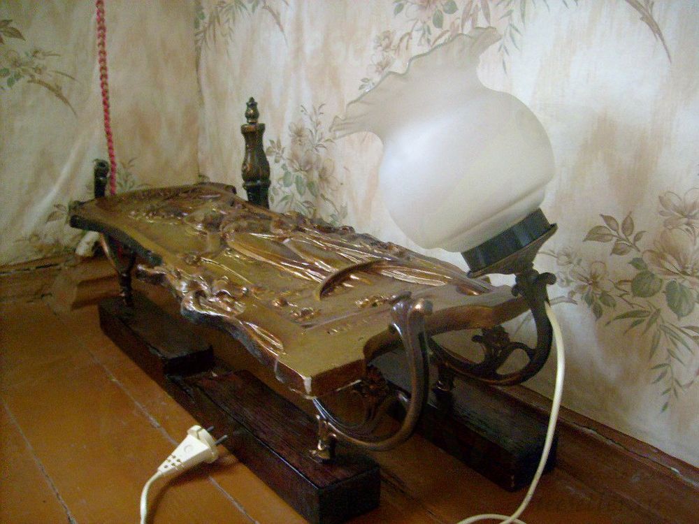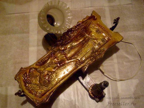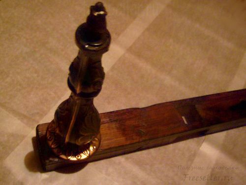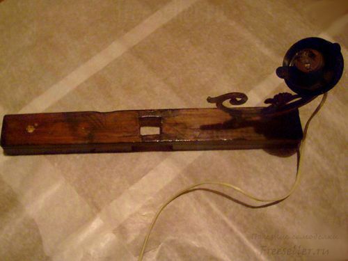 Напольный светильник мы сконструировали из деталей старой люстры, крестовины под ёлку, керамического панно и электрического провода с вилкой. Использовали наждак, морилку и инструменты - стамеску, молоток, отвёртку.