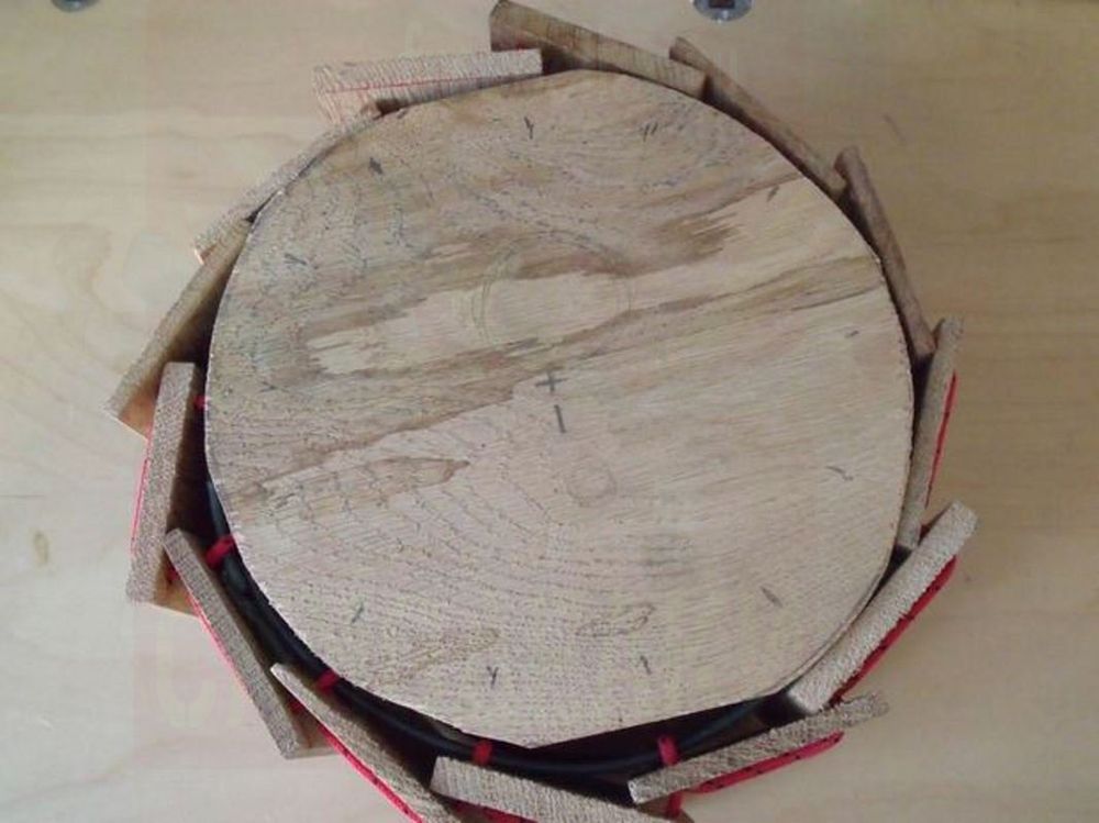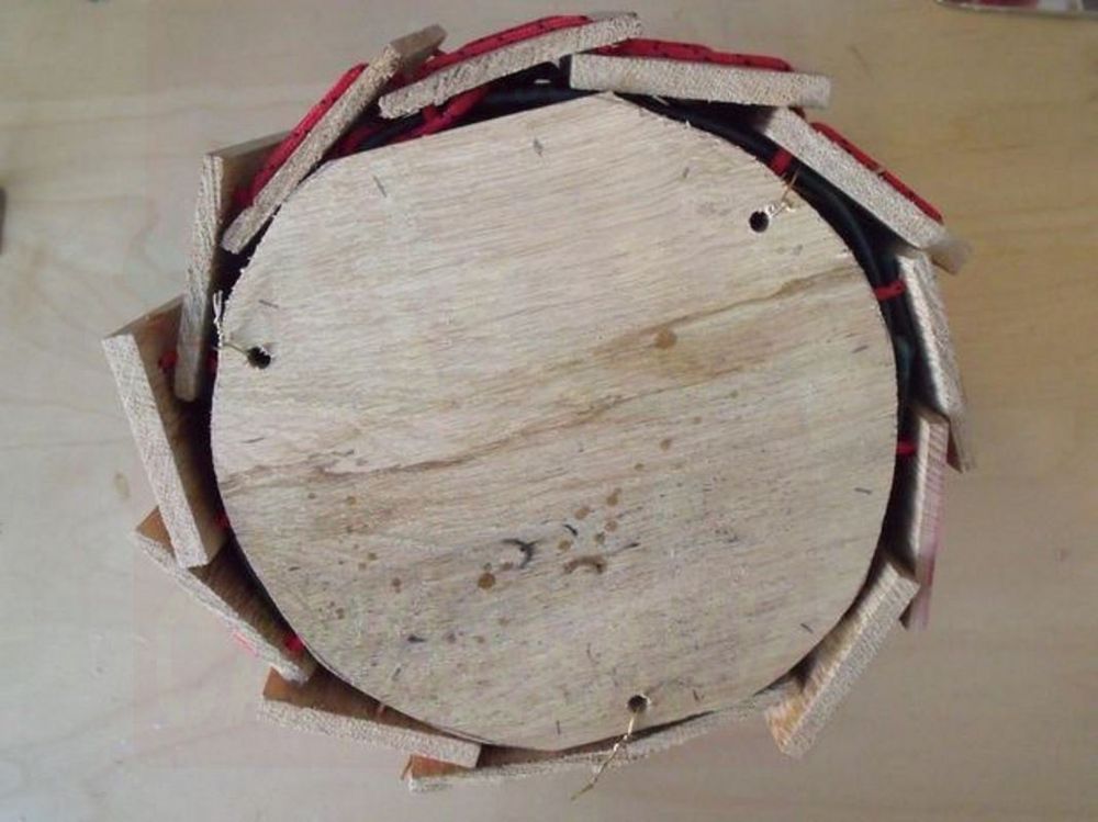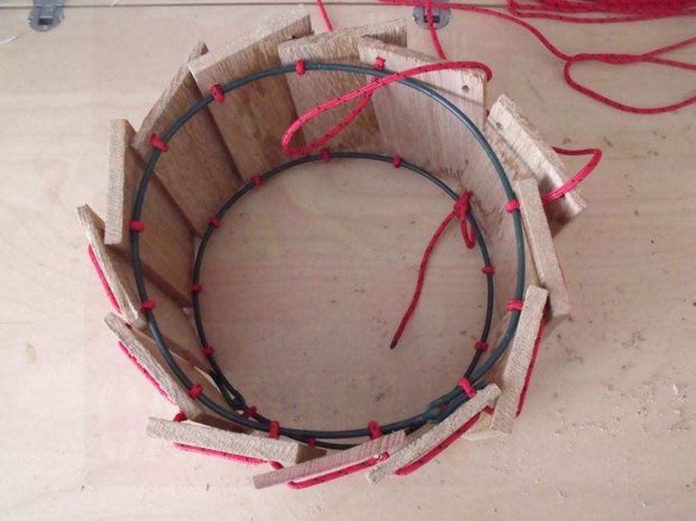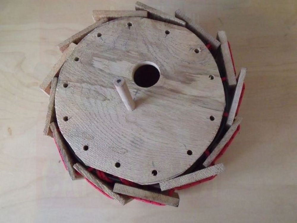 Когда все веревки и проволока будут продеты и затянуты, должно получиться колесо. После этого необходимо по бокам вставить деревянные диски, в которых по кругу предварительно были сделаны отверстия.
