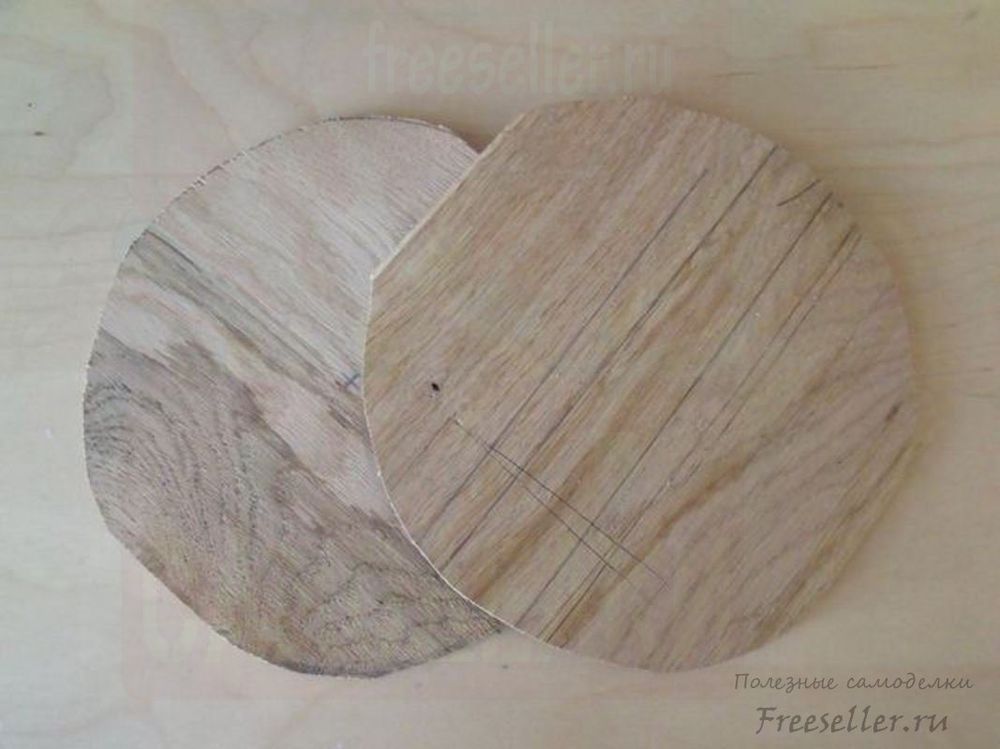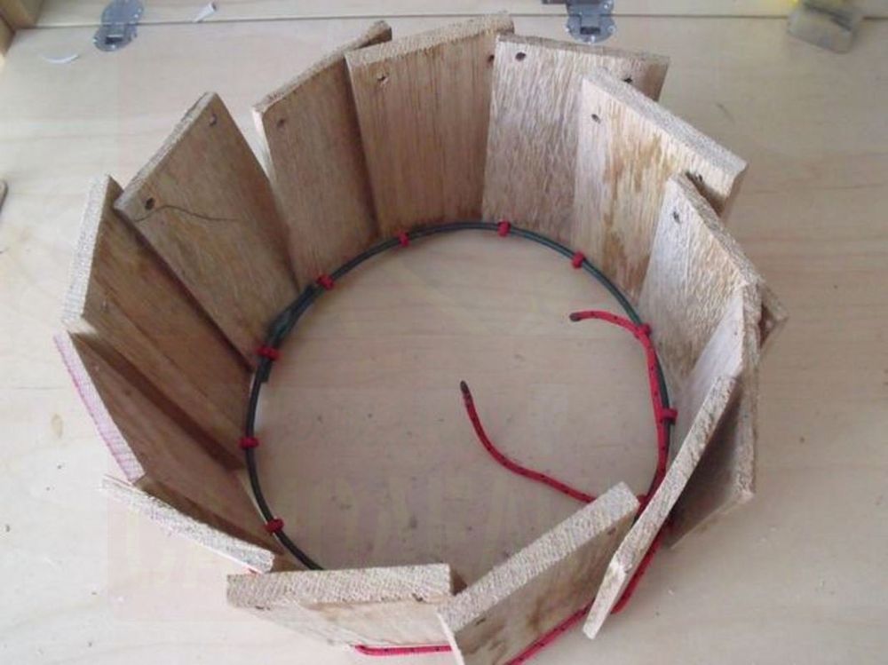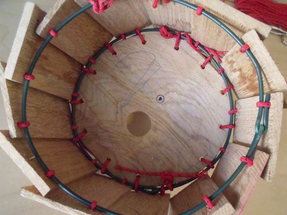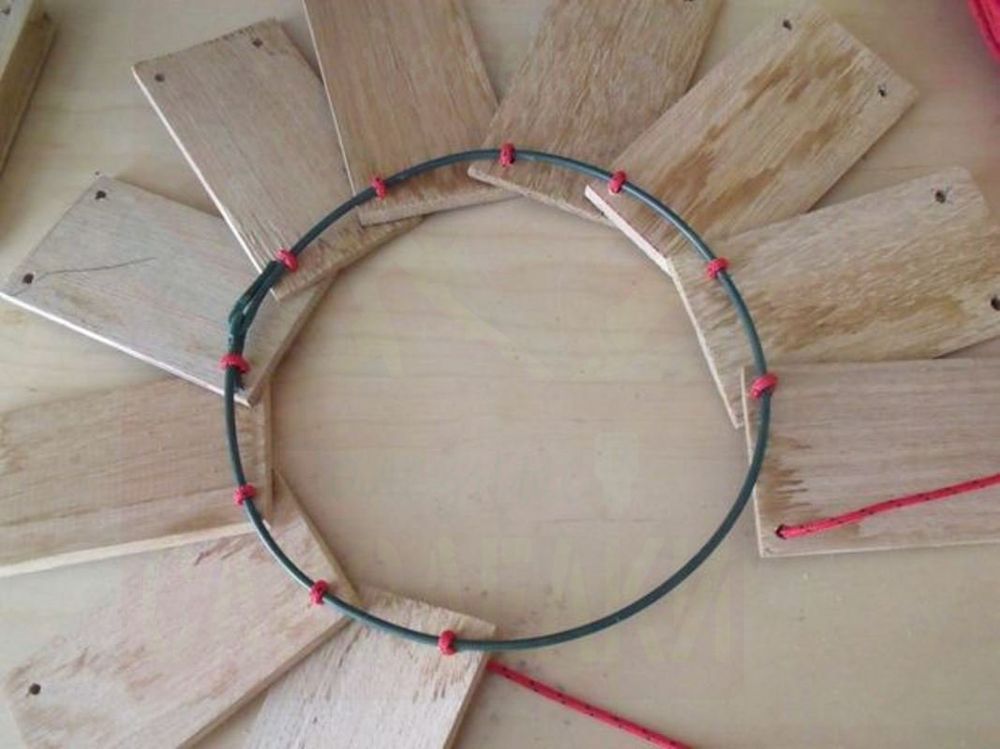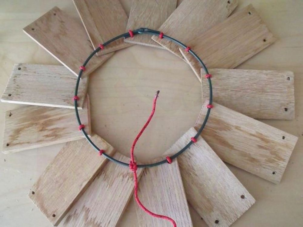Когда все веревки и проволока будут продеты и затянуты, должно получиться колесо. После этого необходимо по бокам вставить деревянные диски, в которых по кругу предварительно были сделаны отверстия.
