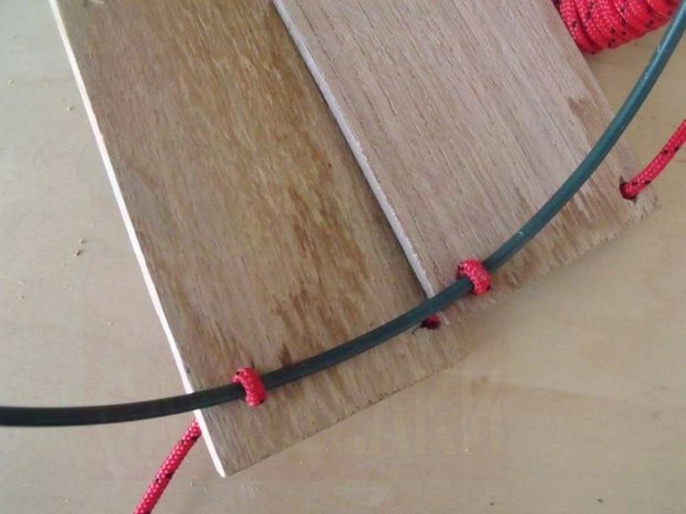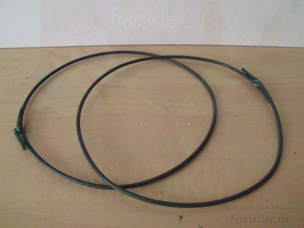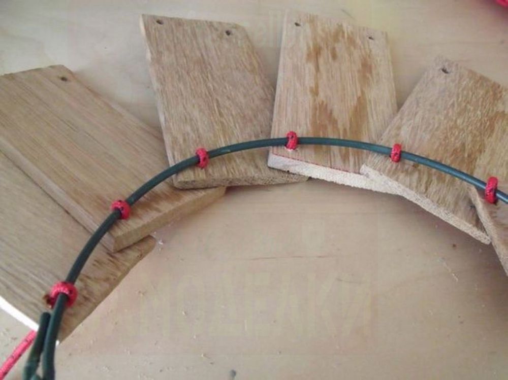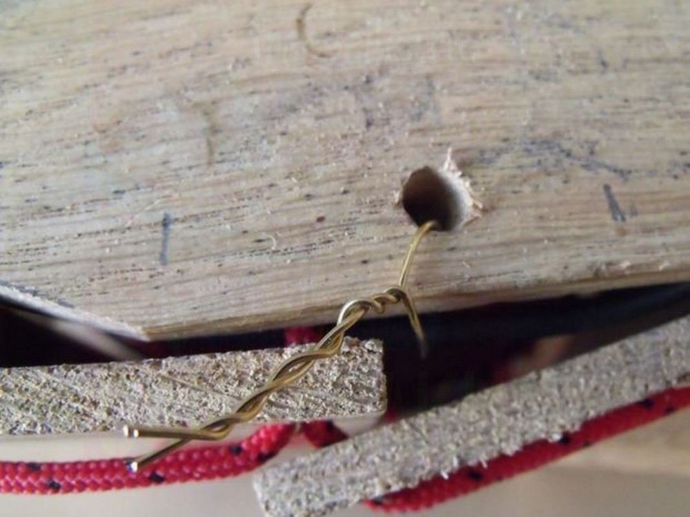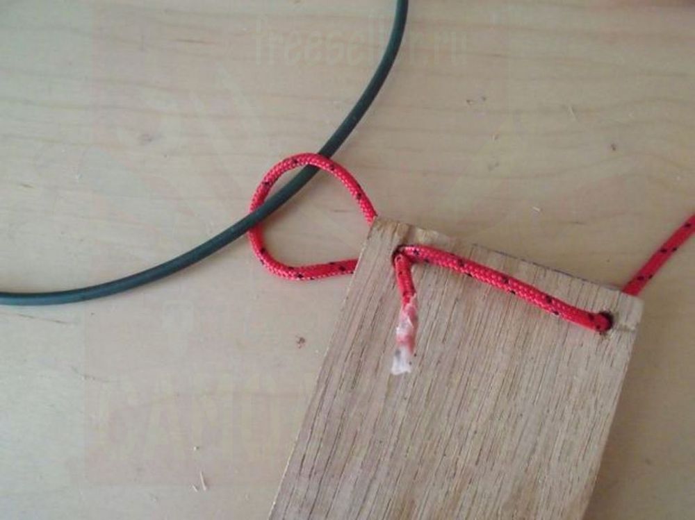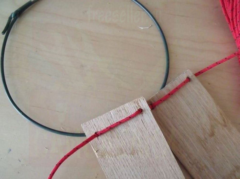 После этого необходимо взять металлическую проволоку и сделать из него кольцо. Затем возьмите крепкую веревку (паракод) и проденьте ее в каждое проделанное отверстие. Веревку необходимо вдеть так, чтобы получилось колечко , а в него необходимо продеть проволоку.