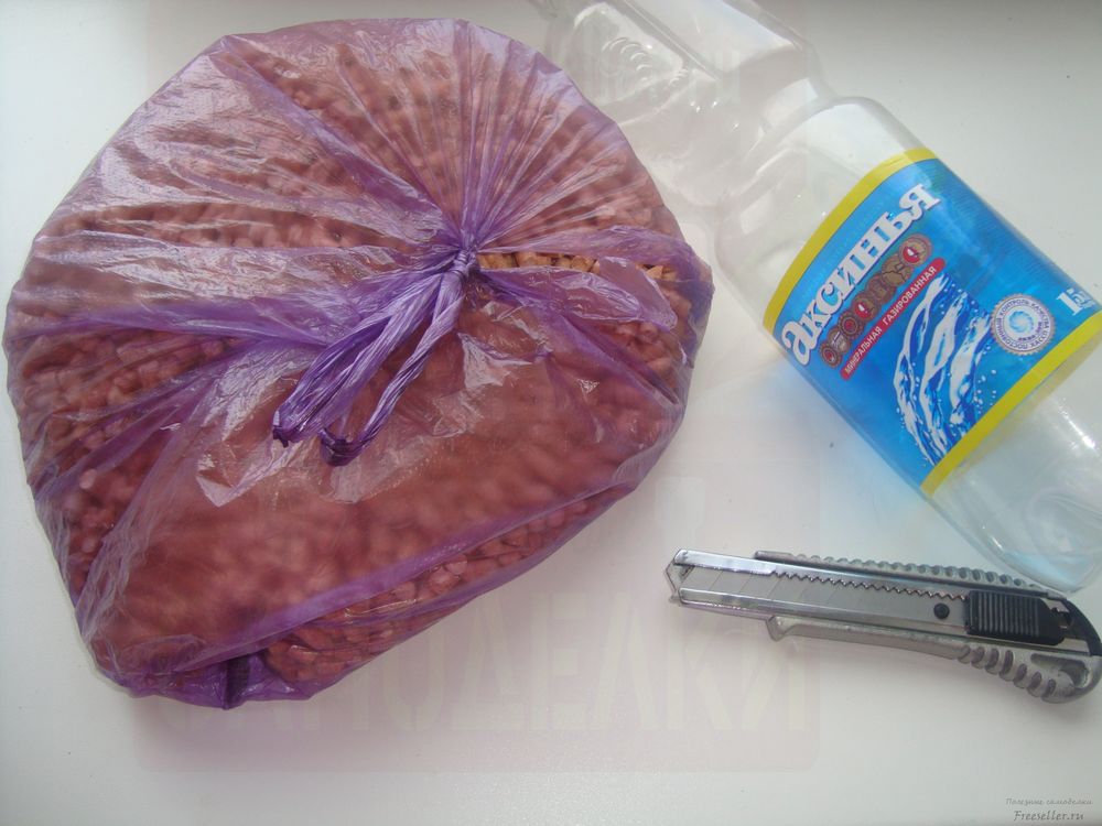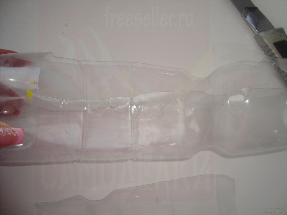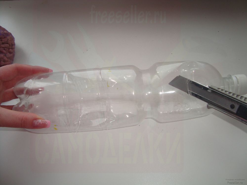 На первом этапе ножиком нужно сделать прямоугольное отверстие. Оно занимает меньшую площадь, нежели половина бутылки. Через это "окно" будет расти лук. Если сделать прорезь большой, то будет высыпаться земля и будет недостаточно площади для формирования корней.