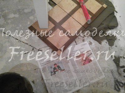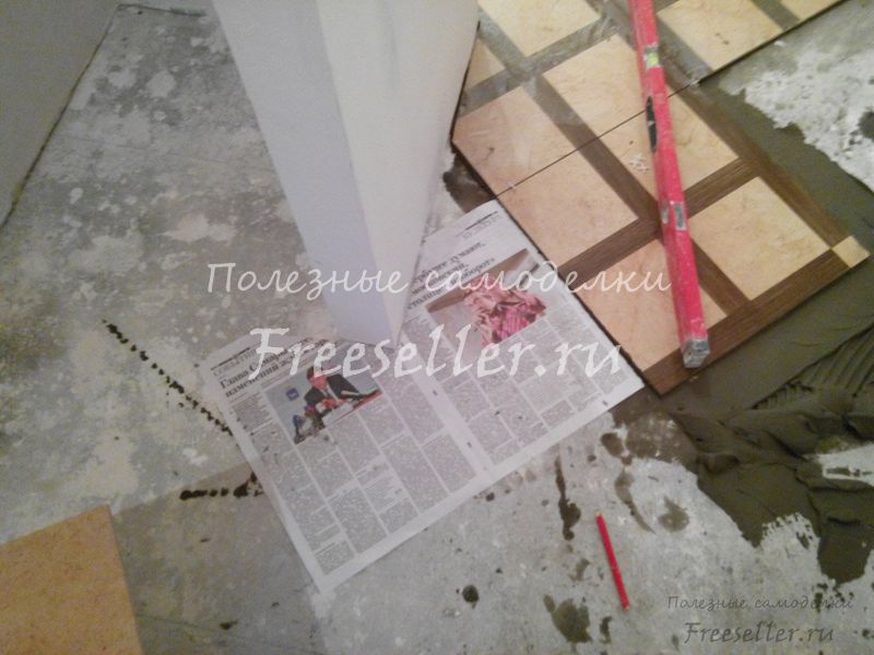 Сделать простые подрезки на плитке не сложно, померил и отрезал, но когда необходимо сделать сложные подрезки в нескольких плоскостях, не сразу сообразишь, как ее нужно правильно разрезать, и здесь на помощь приходит шаблон, вырезанный из обычной газеты.