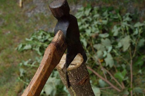 Нарезаем деревья поперек. Нужно быть осторожным, чтобы не пораниться топором. Крепко держите дерево, чтоб оно не выскочило. Часто деревья не разрубаются ровно пополам. Для этого нужно не спешить и аккуратно разрубать топором ствол. Ручной пилой можно сделать стол более гладким, спиливая торчащие веточки.