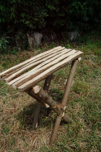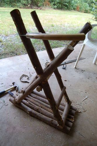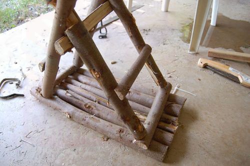 Возьмите четыре ствола, какой хотите высоты. Посередине каждого сделайте прорезь, вырезая кусочек дерева. Поставьте стволы крестиком так, чтобы они соединялись в вырезанных местах. Между ножками и на месте скрещивания прибейте по короткому кусочку дерева.