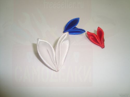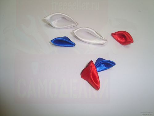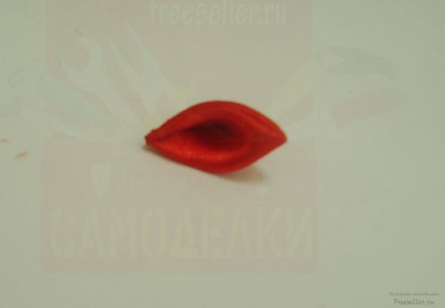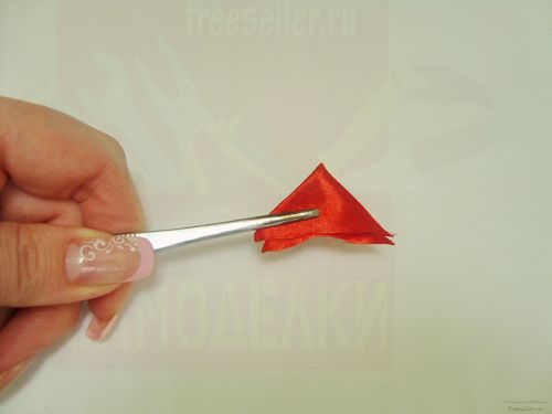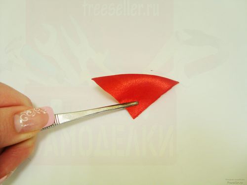 На первом этапе отрежьте от ленты лоскут длиной в 30 см и сверните его таким образом как на фото. Обязательно нужно сделать срезы концов ленты под углом и опалить пламенем, чтобы лента не рассыпалась.