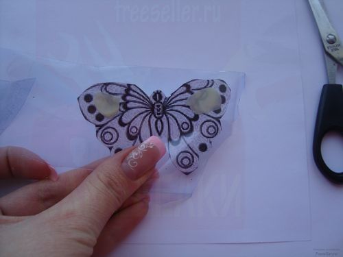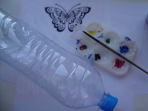 Бабочку нужно вырезать по контуру. От бутылки нам понадобится лишь ее часть, ширина которой не меньше размера бабочки.
