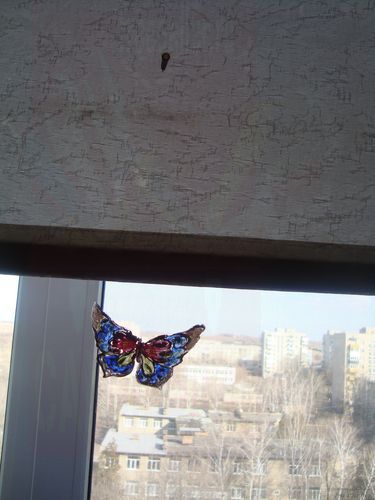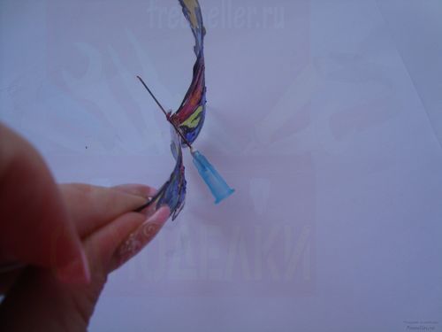 Бабочка крепится с помощью пластилина или другого липкого материала ко внутренней стороне бутылки.