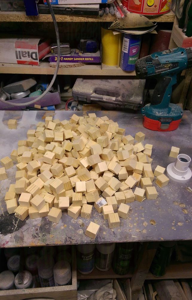 Перед нарезкой пометьте на дереве размер кубиков или настройте размер на вашей пиле. Так будет легче, и все кубики будут нарезаны ровно и одинаково.Сколько кубиков вы нарежете, зависит от того, какого размера и высоты вы хотите сделать лампу.