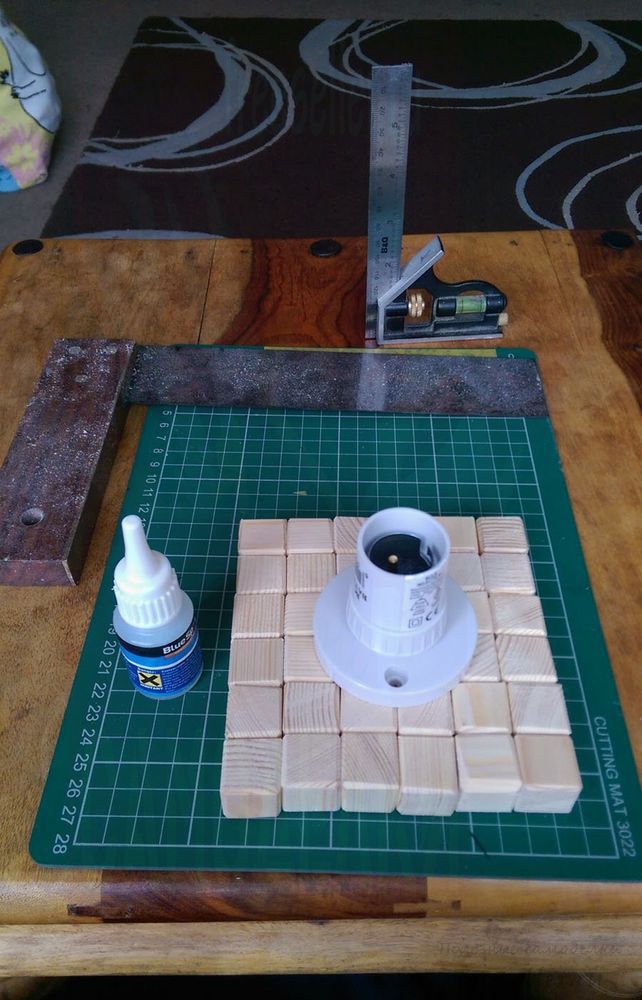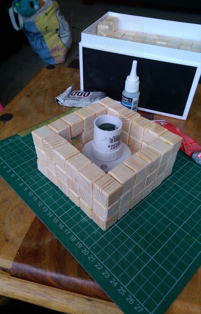 Постройте первый ряд из кубиков. Можно 6 X 6. Все кубики хорошо приклеивайте друг к другу. Поставьте лампу на первый ряд. Начинайте обклеивать кубиками лампу вокруг.