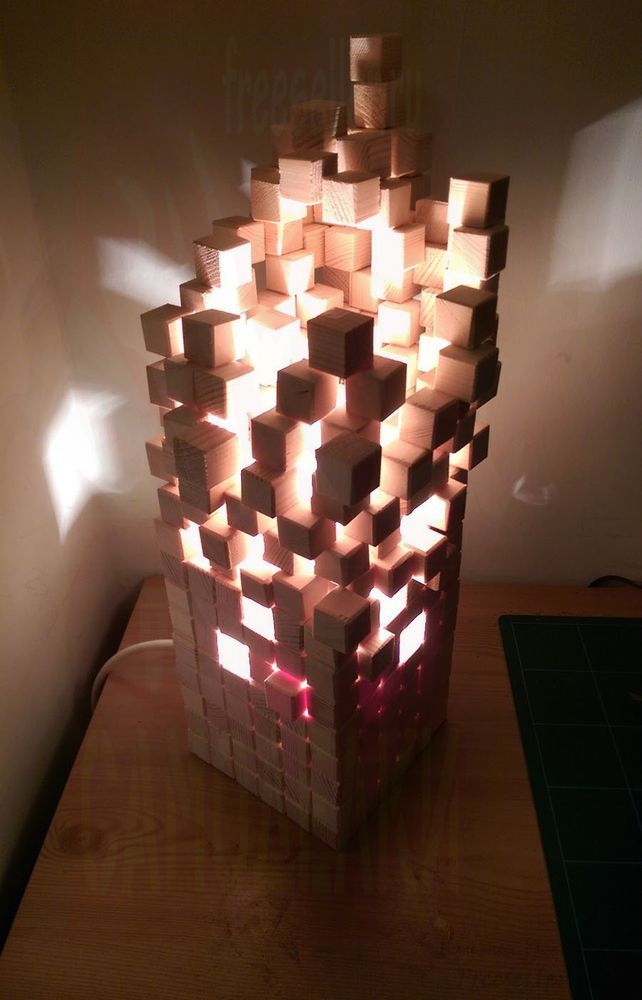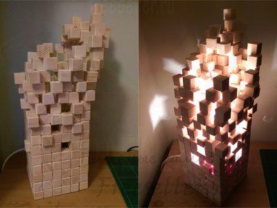 Лампа может быть квадратно или прямоугольной формы. Выстраивайте этажи из кубиков. Не забудьте просунуть шнур от лампы между кубиками. Можно местами кубики вытаскивать начиная с самого низа. Из этих отверстий будет просвечиваться свет лампы. Это будет смотреться очень красиво.