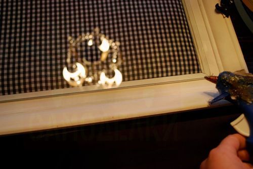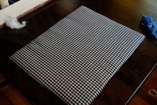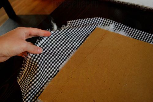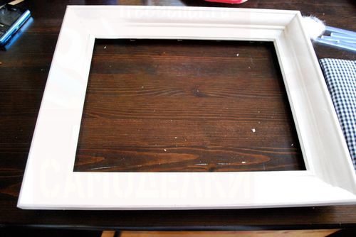 Теперь нужно чем-то красивым и подходящим заполнить рамку. Можно вставить красивую картинку, а можно выбрать ткань симпатичной расцветки. Возьмите кусок многослойной фанеры и обтяните его куском ткани. Вставьте фанеру с тканью в рамку и приклейте торчащие с оборотной стороны куски ткани к рамке клеем.