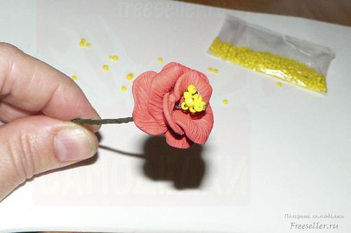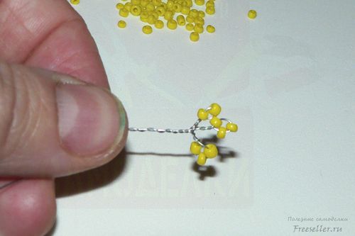 Для цветов нарезаем проволочные отрезки, складываем их вчетверо, нанизываем несколько бусин и вводим в центр цветка, закручиваем. Оборачиваем получившийся стебель тейп-лентой.