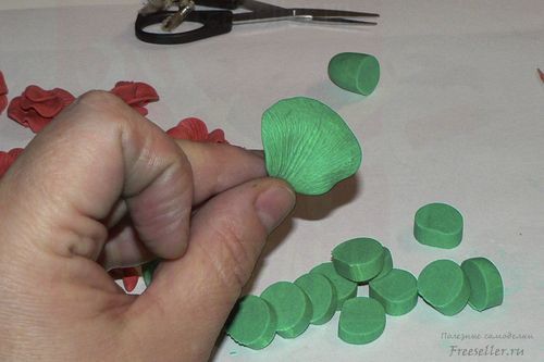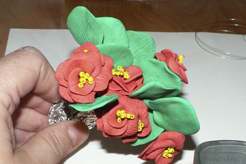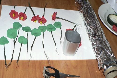 Теперь берем фольгу, складываем ее в несколько раз и заворачиваем в нее листья и цветы.