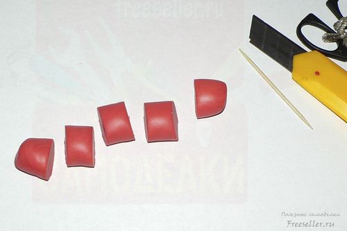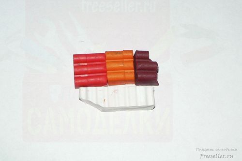 Начинаем работу со смешивания нескольких цветов полимерной глины, чтобы получить реалистичный оттенок, присущий живым цветам фиалки. Нам нужно нечетное количество цветов, например, семь. Нарезаем получившийся материал на нужное количество частей и каждую часть делим на восемь-девять заготовок для лепестков.
