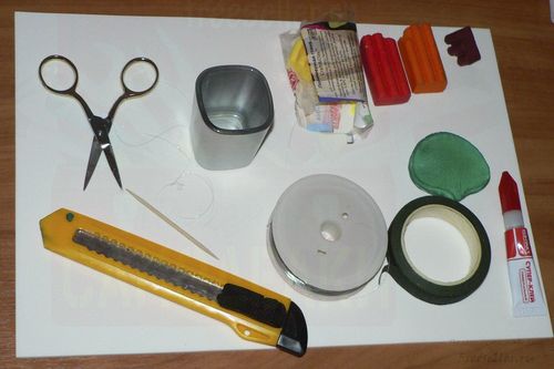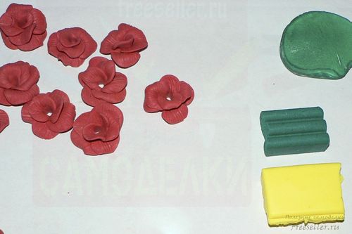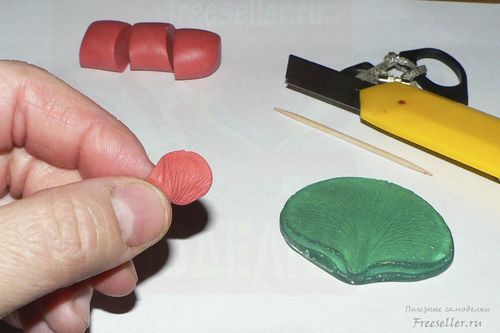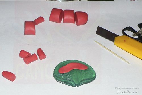 Теперь смешиваем зеленый и желтый цвет, нарезаем получившийся материал на несколько частей и делаем листики, так же прикладывая их к молду.