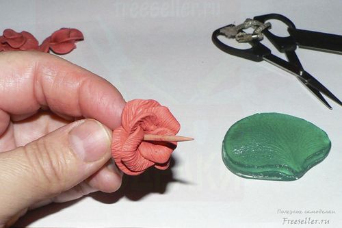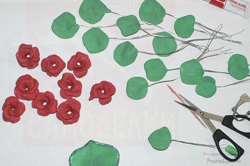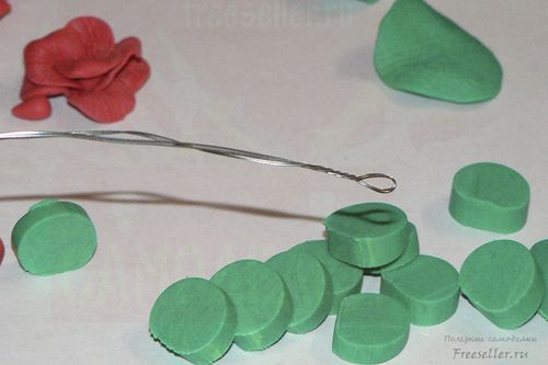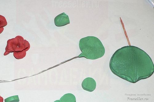 Скручиваем небольшие отрезки проволоки вчетверо, прикладываем проволоку к изнанке листика и, взяв небольшой кусочек зеленой пластики, крепим проволоку к листику.