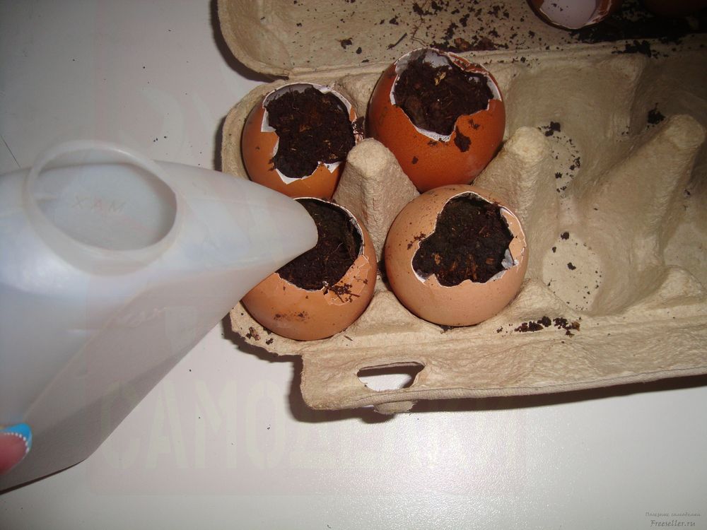 Далее, в каждую экологически чистую "емкость" поместите землю. Ее удобнее накладывать маленькой ложкой. Не заполняйте яйцо землей до краев - ведь потребуется место для полива.