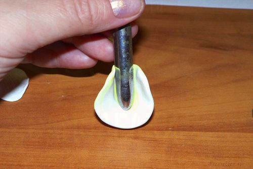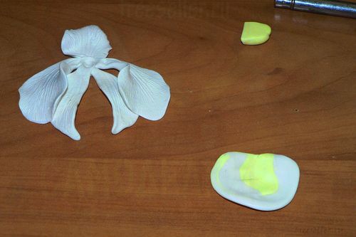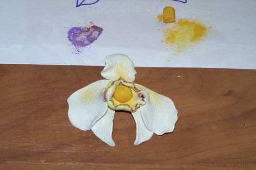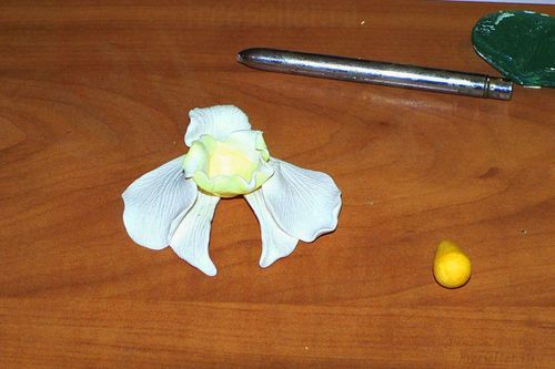 Из темно-желтой пластики лепим капельку-пестик, прикрепляем, придавливая стеком в центр сердцевины.