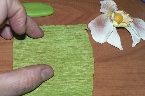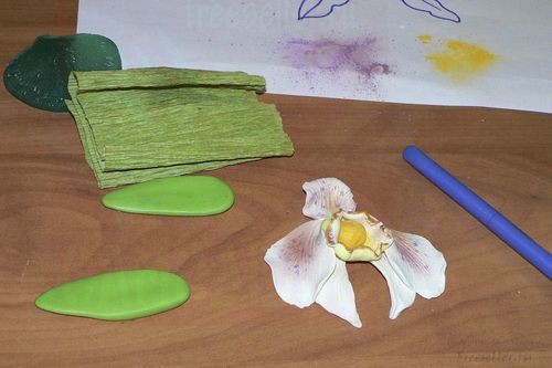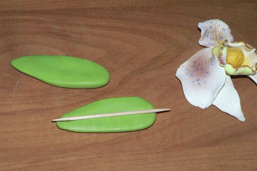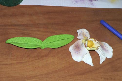 Теперь берем зеленую пластику и формируем листья орхидеи.