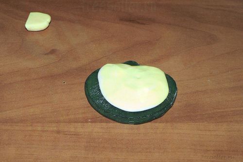 Берем желтую пластику, расплющиваем ее в круглую лепешку, по краям прилепляем белую, прокатываем.