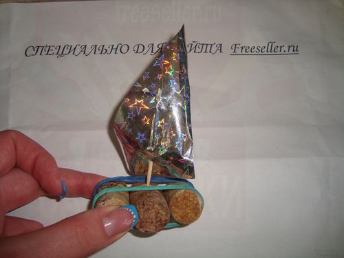 Другой край зубочистки втыкаем в центр плота и наш кораблик готов.
