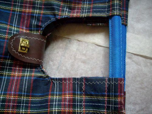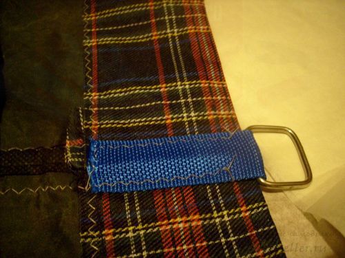 Надеваем пряжки. Заворачиваем верхний конец стропы вовнутрь сумки и пристрачиваем с обеих краёв зигзагом.