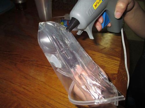 Будьте осторожны с горячим клеем, не обожгитесь. Держите форму вертикально, пока клей не остынет. Постепенно начинайте покрывать клеем всю поверхность формы из стаканчика.