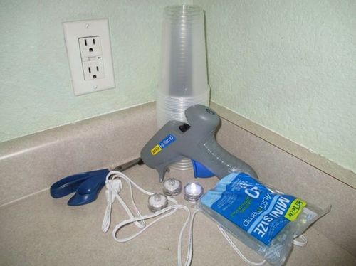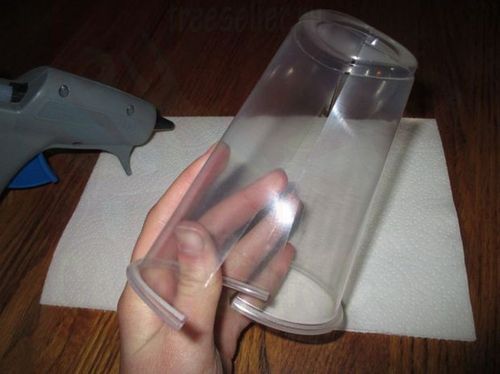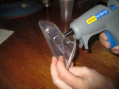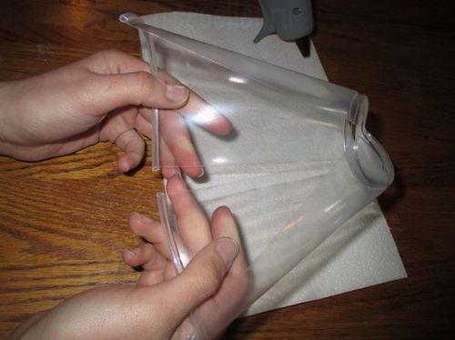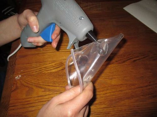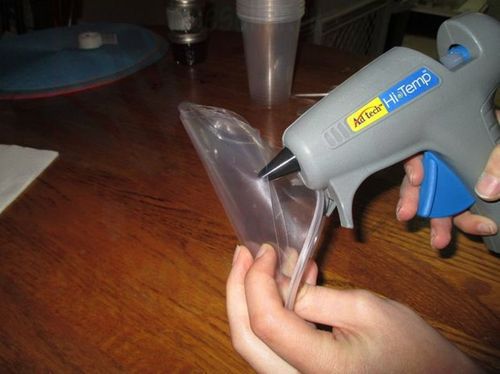 В одной руке держите стакан уже сложенный, как вам угодно и другой рукой при помощи пистолета введите внутрь формы, где кусочки соприкасаются, немного клея.