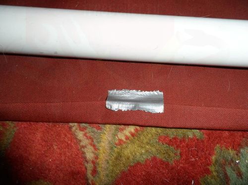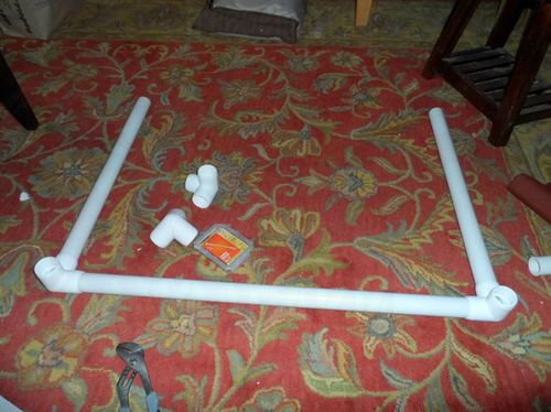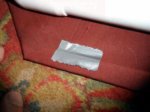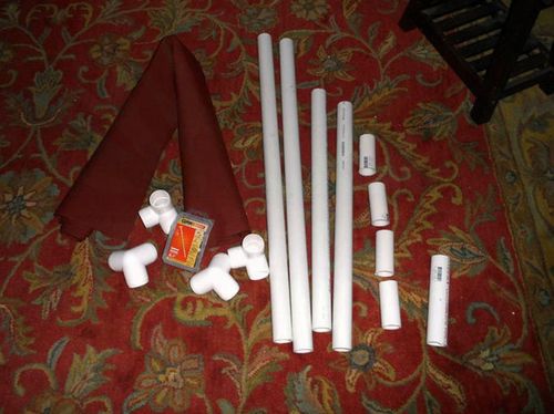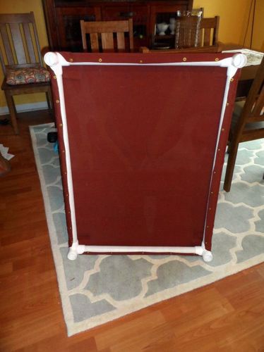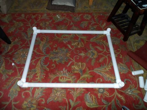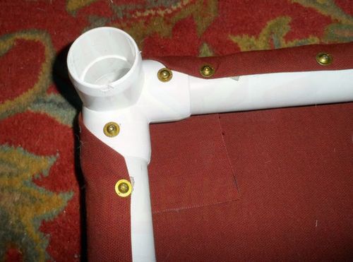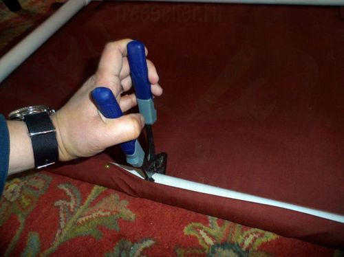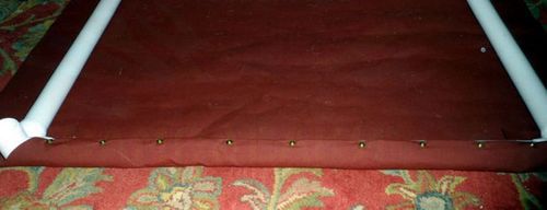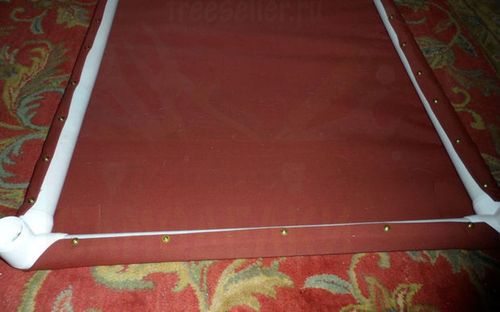 Берем ткань и сгибаем по краям стороны и уголки, приклейте их изолентой чтобы они не разогнулись. Потом вы ее снимите. Обтяните рамку тканью и прибейте болтами ткань к трубам. Изоленту можно снять.