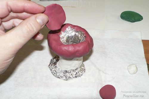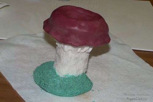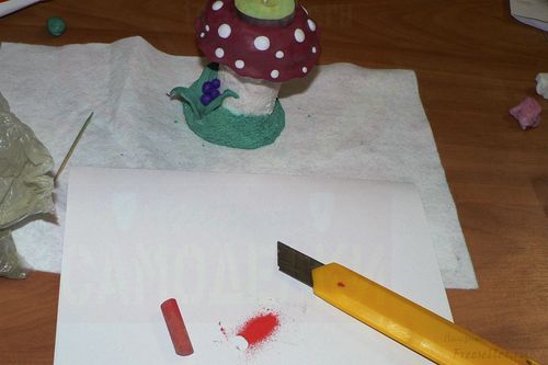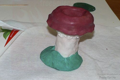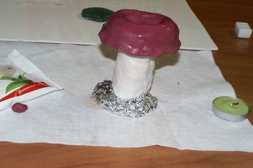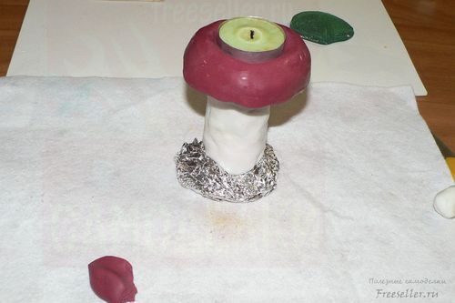 Красной пластикой облепляем шляпку, не забывая про углубление под свечку, примеряем свечу, поставив ее в лунку.