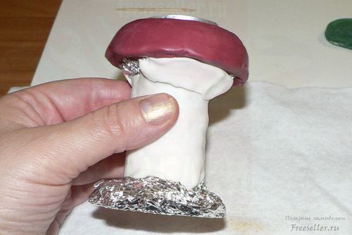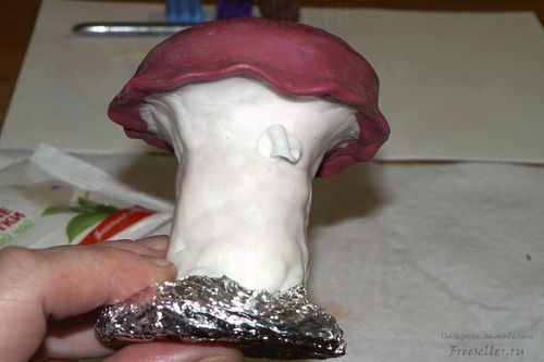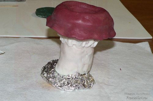 Теперь берем белую глину, разогреваем ее в руках и по кусочку начинаем облеплять ножку будущего гриба.