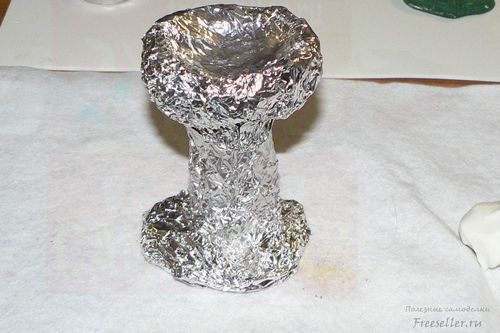 Приступаем к лепке, предварительно создав каркас из фольги, который сделает изделие легче, устойчивее и позволит сократить расход дорогостоящего материала. Если вы хотите сделать подсвечник большим, то просто сделайте из фольги шляпку с углублением под свечу и примотайте ее фольгой к баночке. Сделать форму поменьше можно, используя только фольгу, что мы и будем делать.