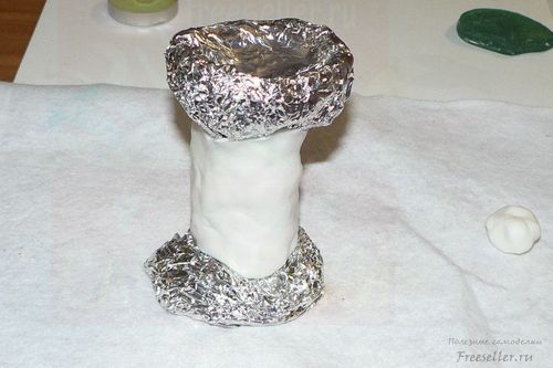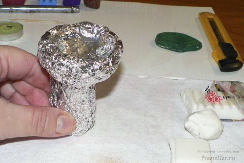 Сначала из фольги скатаем ножку, затем шляпку, объединим все это еще одним слоем фольги. Как следует приваливаем фольгу, чтобы каркас был плотным.