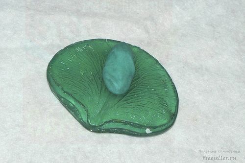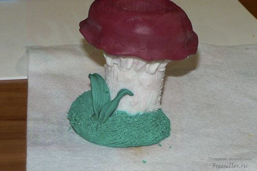 Теперь украсим постамент нашего гриба ягодами. Для этого возьмем зеленую глину и вылепим три продолговатых листика, приложим их к молду и прилепим основанием к постаменту, а боками к грибу.
