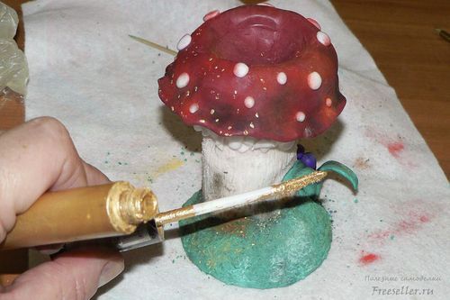 Завершающий штрих - добавление маленьких золотых пятен и черточек на грибе, листиках и траве. Делаем это при помощи доступных средств: акриловой краски или жидких золотых теней.