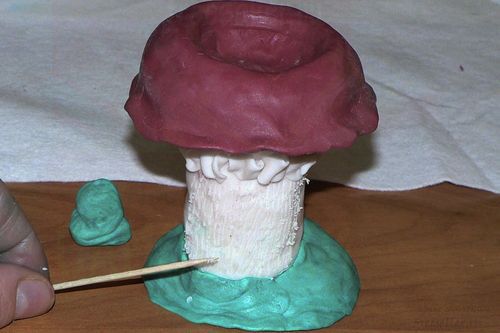 Следующий этап: белой глиной формируем пространство под шляпкой, затем лепим так называемое грибное кольцо, то есть ту волнистую часть, что размещается ниже шляпки на ножке.